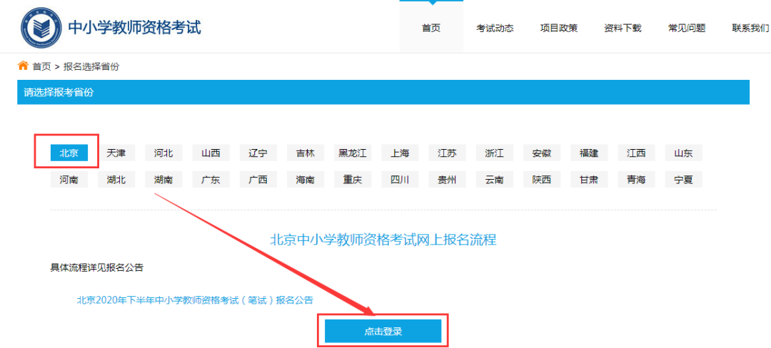 考生进入报名系统后,选择好报名省份,点“点击登录”。